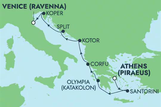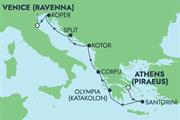 Flogið til Aþenu með Icelandair og SAS. Brottför frá Keflavík kl.07:40 og lent í Kaupmannahöfn kl. 12:55. Brottför með SAS kl.14:30 og lendum í Aþenu kl.18:50. Gistum í þrjár nætur og förum síðan í 7 nátta siglingu með NCL Pearl frá Aþenu (Pireus) þar sem komið er við í Mykonos í Grikklandi, Olympia Katakolon í Grikklandi, Corfu í Grikklandi, Kotor í Svartfjallalandi, Split í Króatíu, Koper í Slóveníu og svo endað í Ravena (Feneyjum). Ekið til Feneyja og þar gistum við í tvær nætur áður en við fljúgum með AIT Airways og Icelandair heim. Brottför frá Feneyjum kl. 11:20 og lent í Róm kl.12.30. Brottför með Icelandair frá Róm kl.16:20 og lent í Keflavík kl.19:10